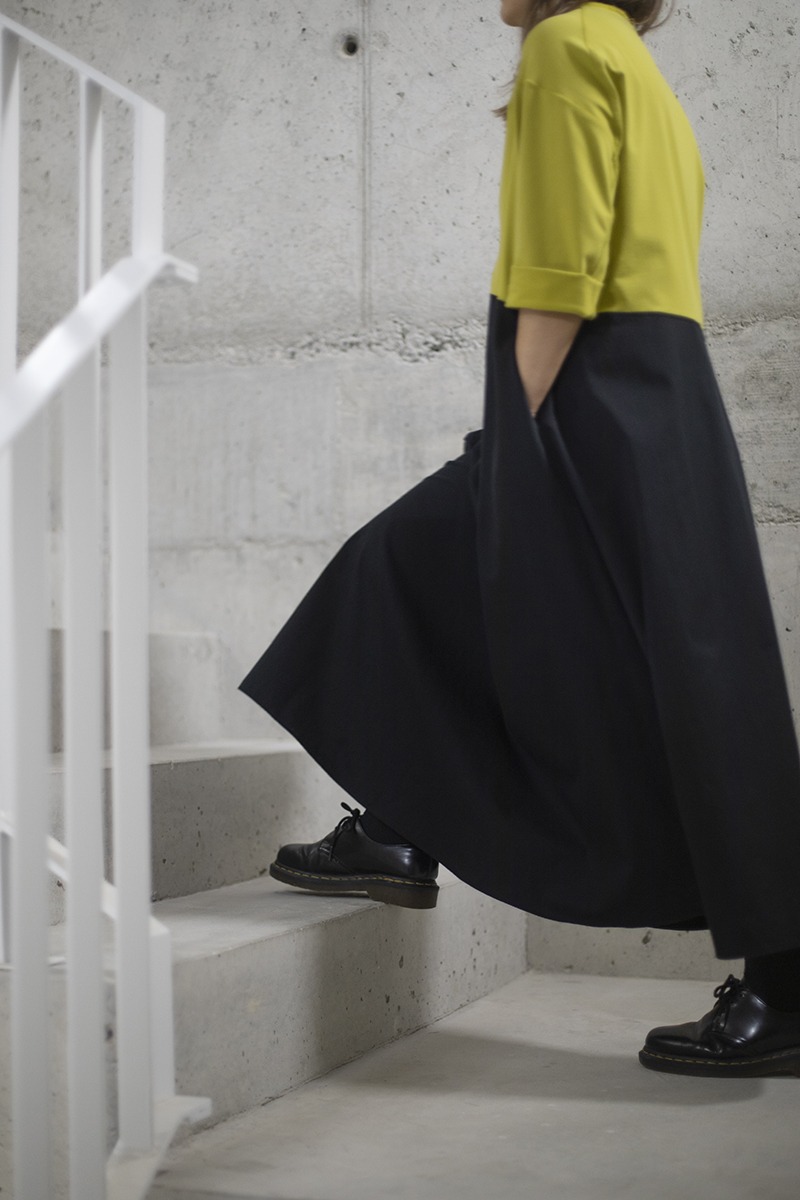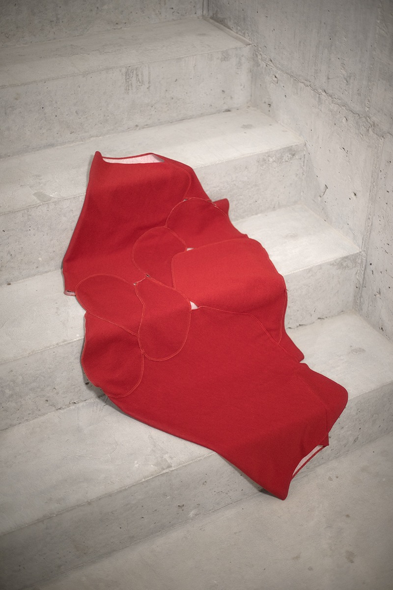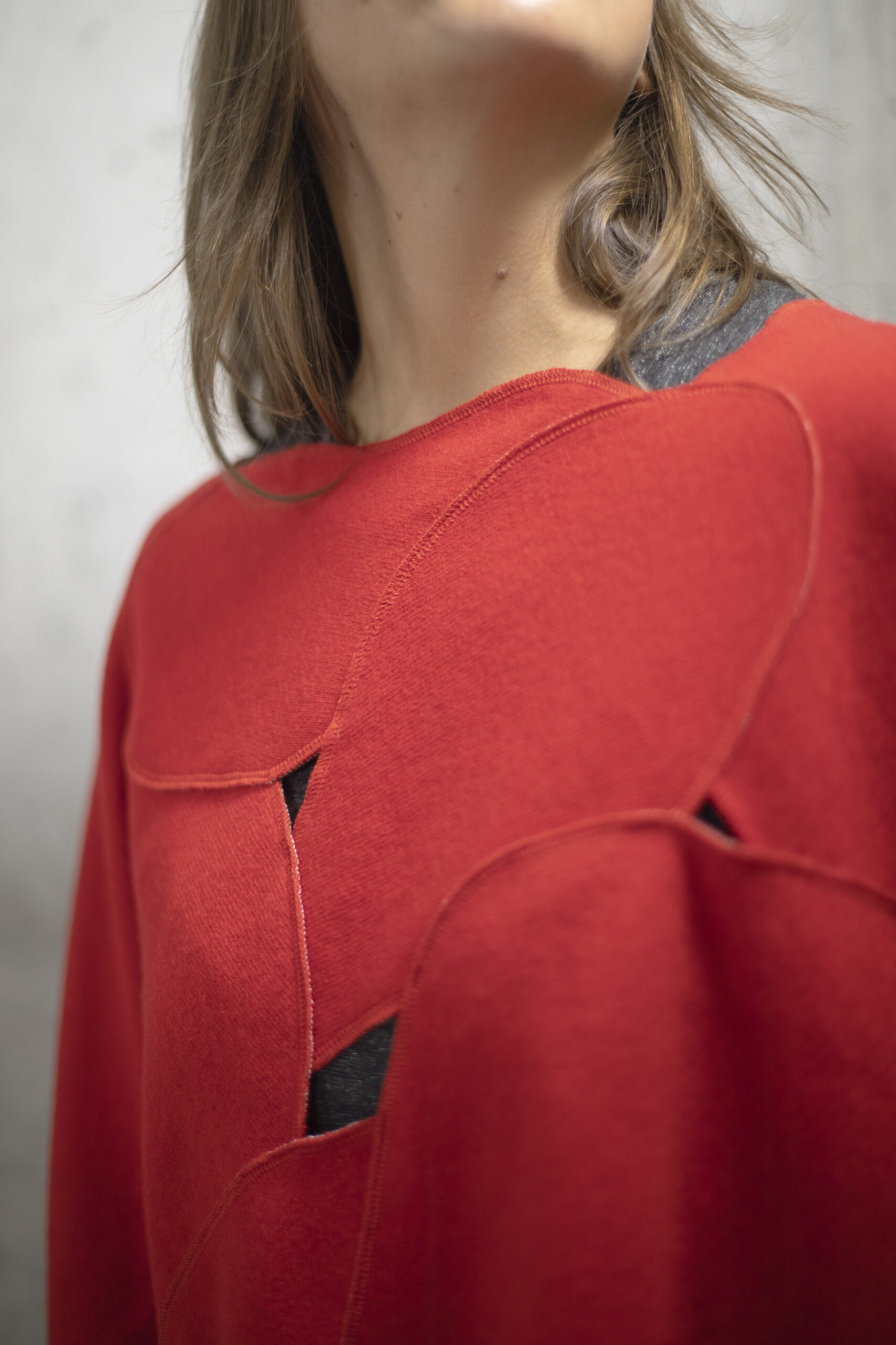 as UP sweaters são camisolas oversized resultado da transformação de saias (produzidas para desfile). Todas as peças são diferentes, na frente vemos um jogo de aplicações feitas com o aproveitamento dos bolsos que compõe um desenho orgânico e assimétrico, estendendo-se tanto para as mangas como para a bainha. Nas costas conseguimos ver as pinças e o cinto invertido da saia.